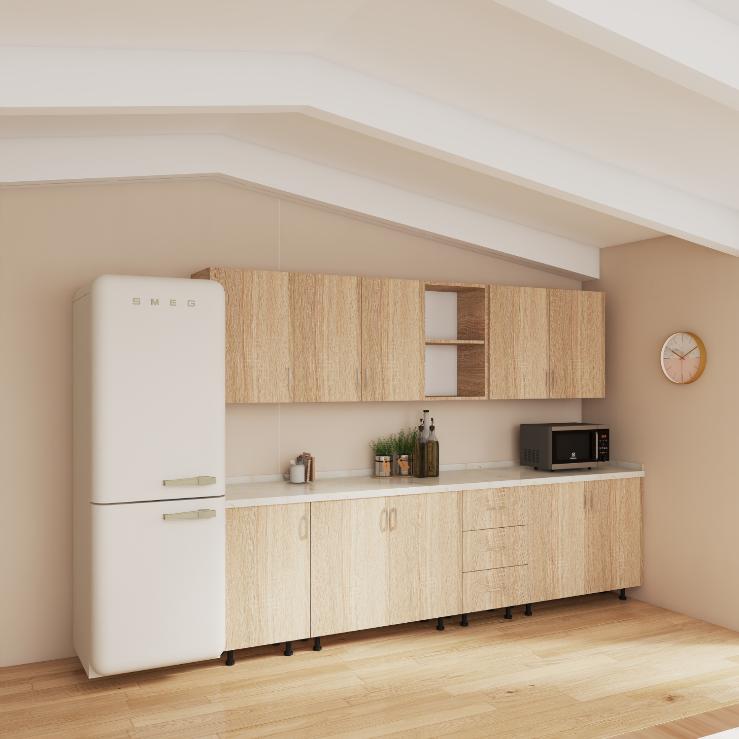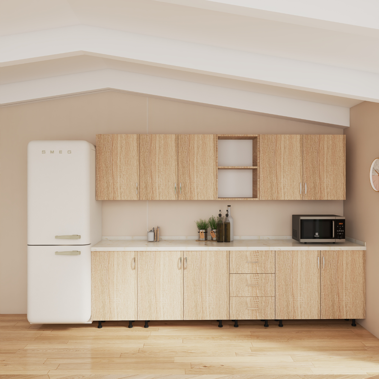 • Material Durabil: Fabricată din PAL de 18mm, bucătăria asigură rezistență și durabilitate în timp, fiind perfectă pentru utilizarea zilnică.