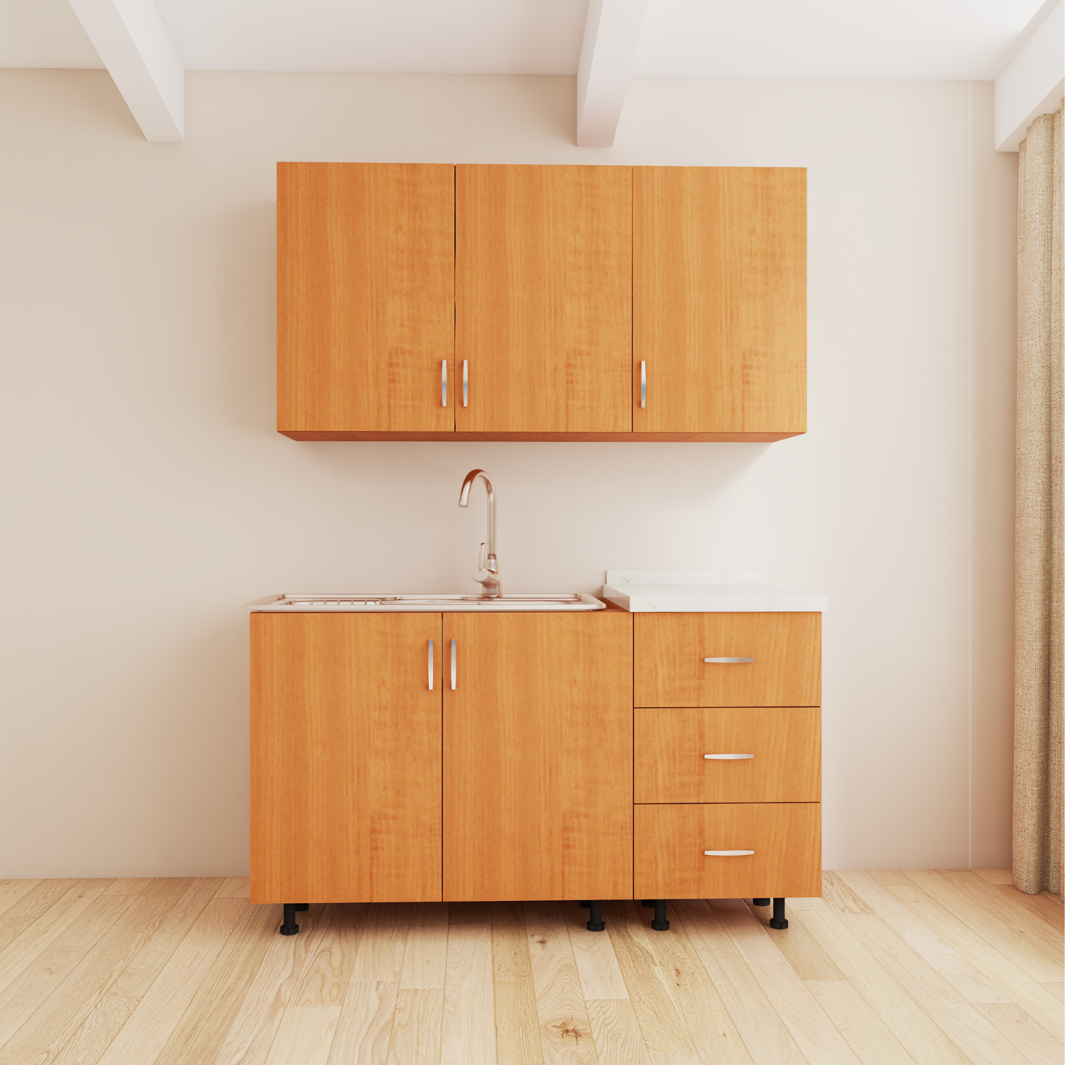 • Material Durabil: Fabricată din PAL de 18mm, bucătăria asigură rezistență și durabilitate în timp, fiind perfectă pentru utilizarea zilnică.