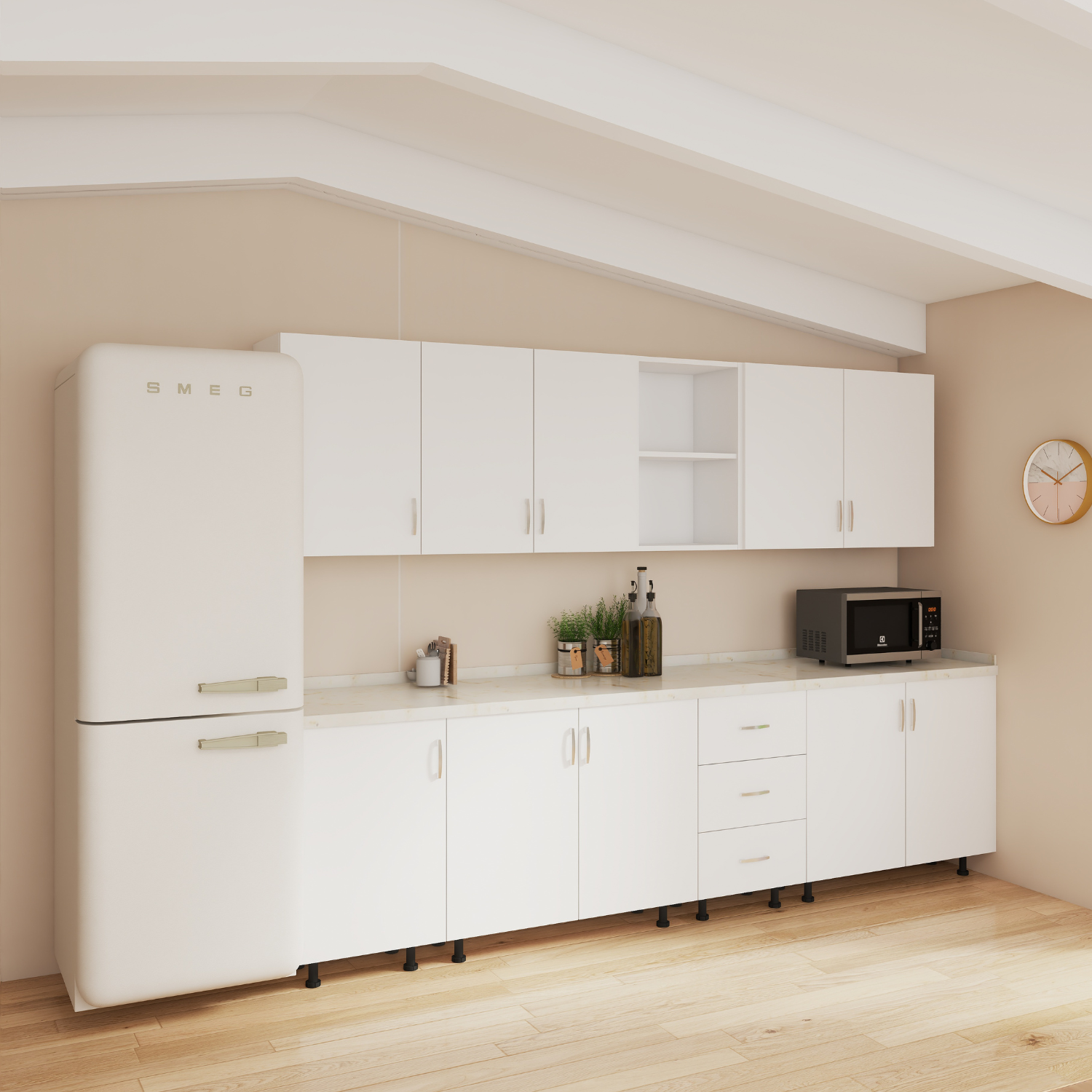 • Material Durabil: Fabricată din PAL de 18mm, bucătăria asigură rezistență și durabilitate în timp, fiind perfectă pentru utilizarea zilnică.