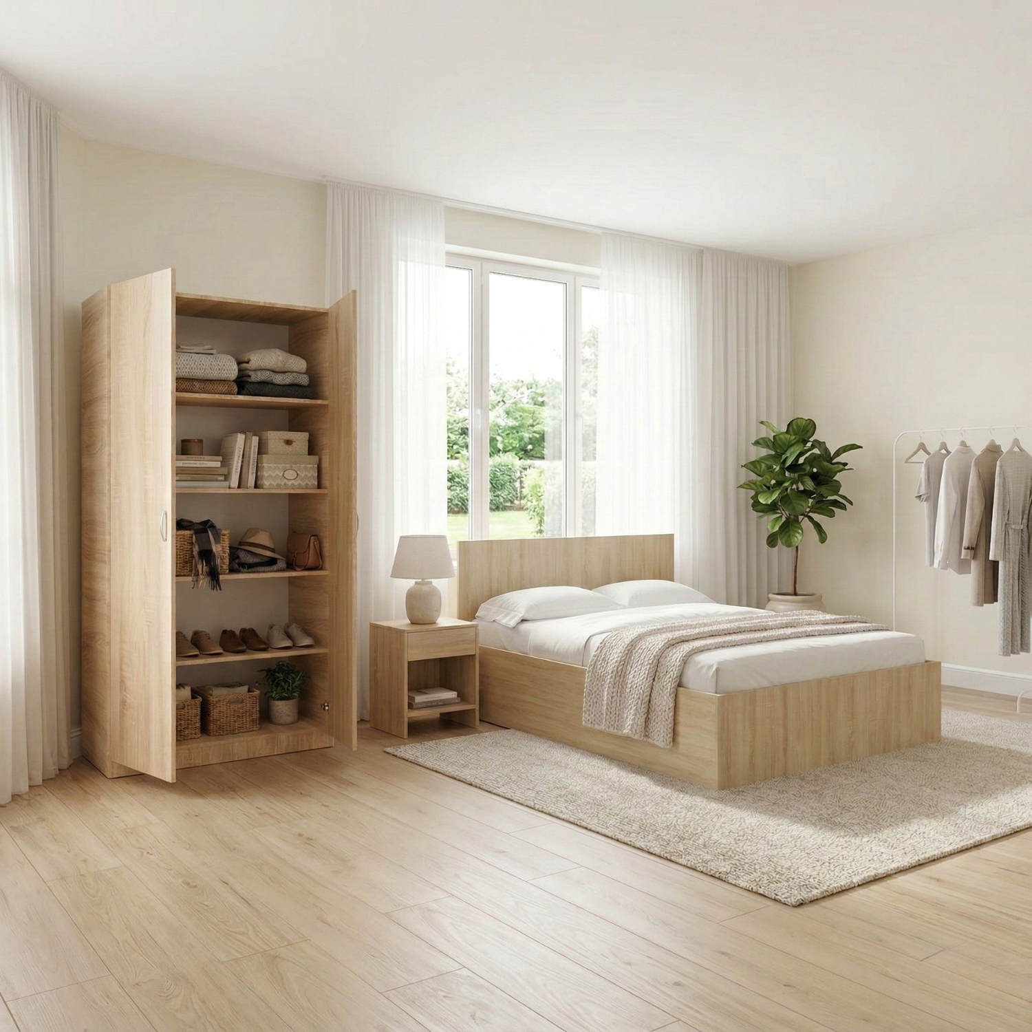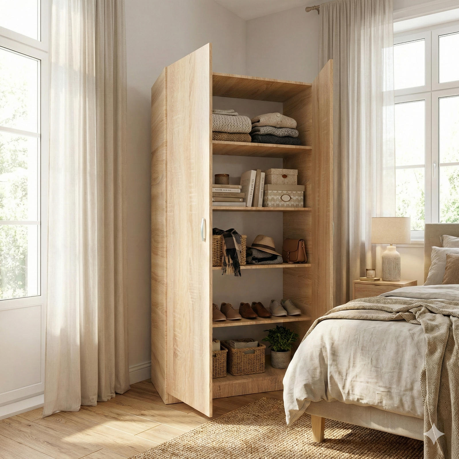 Amenajează-ți dormitorul cu un set de mobilier modern și rezistent, realizat din PAL melaminat de 18 mm, ideal pentru utilizare zilnică. Setul de dormitor în culoarea Stejar Sonoma oferă un aspect natural, luminos și elegant, potrivit atât pentru dormitoare moderne, cât și pentru amenajări clasice.